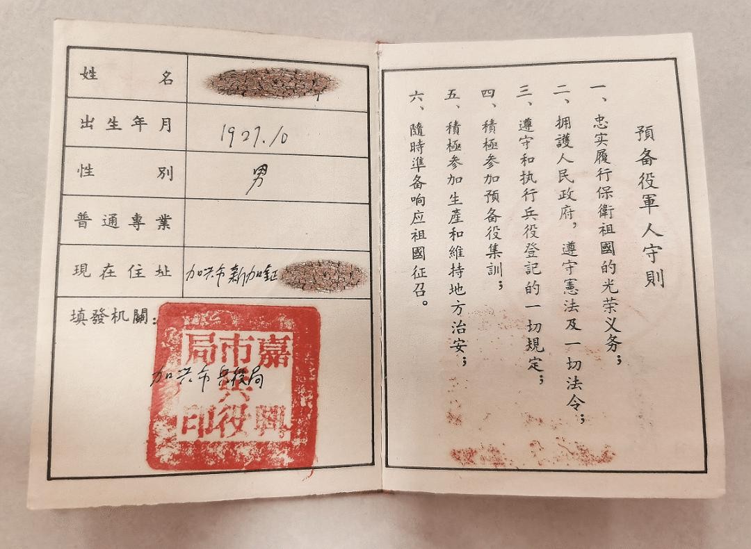 《兵役证》内页以繁体字竖写着“预备役军士和兵证明书”,有中华人民共和国国防部和中华人民共和国元帅、国防部长彭德怀的印章。余页则显示预备役军人守则、姓名、出生年月、现在住址、填发机关等信息。