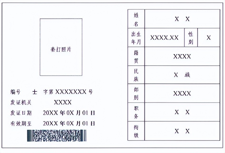 这一版的证件,已经做了很大的改变。当年的官方解析说了四点:一是编制唯一证件号,增强了证件的唯一性、权威性及法律效应;二是更显庄重沉稳、美观整洁,封皮颜色为暗红色,与军装服饰红色元素相协调;三是防伪程度更高,证芯使用专用证券纸和专色油墨定制生产,运用浮雕、定位水印、安全线、解锁、缩微文字、无色荧光等多项防伪技术,易于检验识别;四是可认证度更高,证件内容新增加密二维码,嵌印至证芯底部,可通过军队有关部门查核验证。