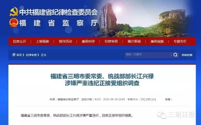 福建省纪委监察厅4月14日下午发布消息:福建省三明市委常委、统战部部长江兴禄涉嫌严重违纪,目前正接受组织调查。