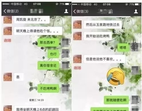12日,周凯旋抵达北京。14日傍晚,谢雕将周凯旋迎进了中科院校外的一家餐厅。席间,谢雕还为周凯旋拍了照片,并发到高中同学群里:“周凯旋已经到北京了”。