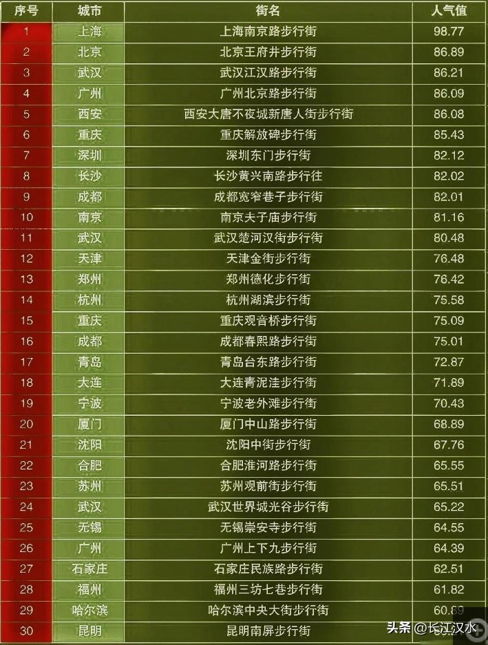 武汉三大步行街全部上榜"中国步行街人气30强”