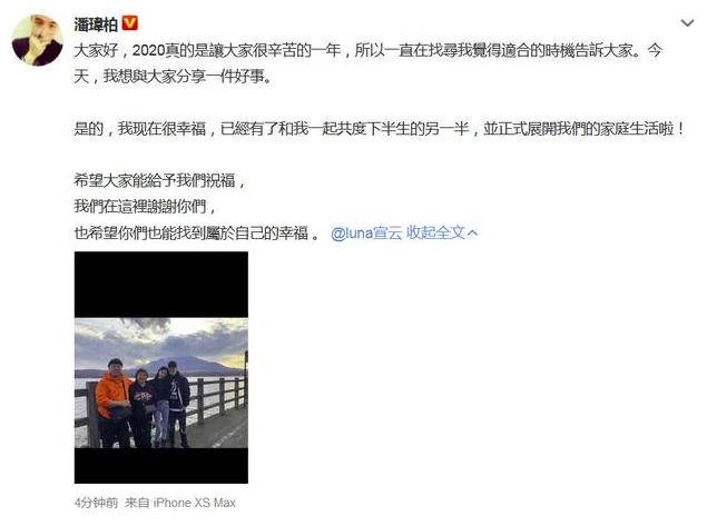 7月27日,潘玮柏在社交网站上官宣了自己结婚的喜讯,他表示“已经有了一起共度下半生的另一半,并正式开展家庭生活”,他还大方@了自己的妻子Luna宣云。