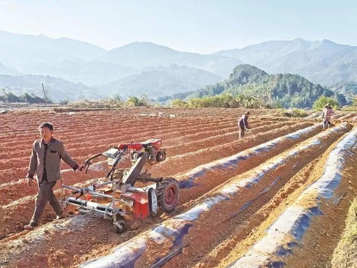 农户们忙着整畦、覆膜。(胡玉萍 摄)