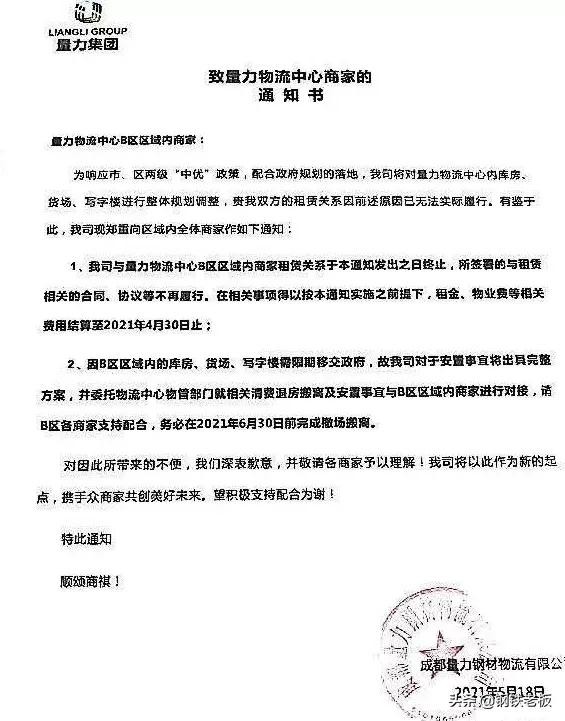 那具体搬迁规划究竟如何?根据此前网上公布的量力物流中心商家通知书我们可略知一二。至于更多搬迁细节动向,成都汇津源钢铁有限公司销售总监彭双告诉我们,“整个B区已经基本搬了一半了,剩下还有一些有货场的商家,要求是在7月31日之前全部搬完。”