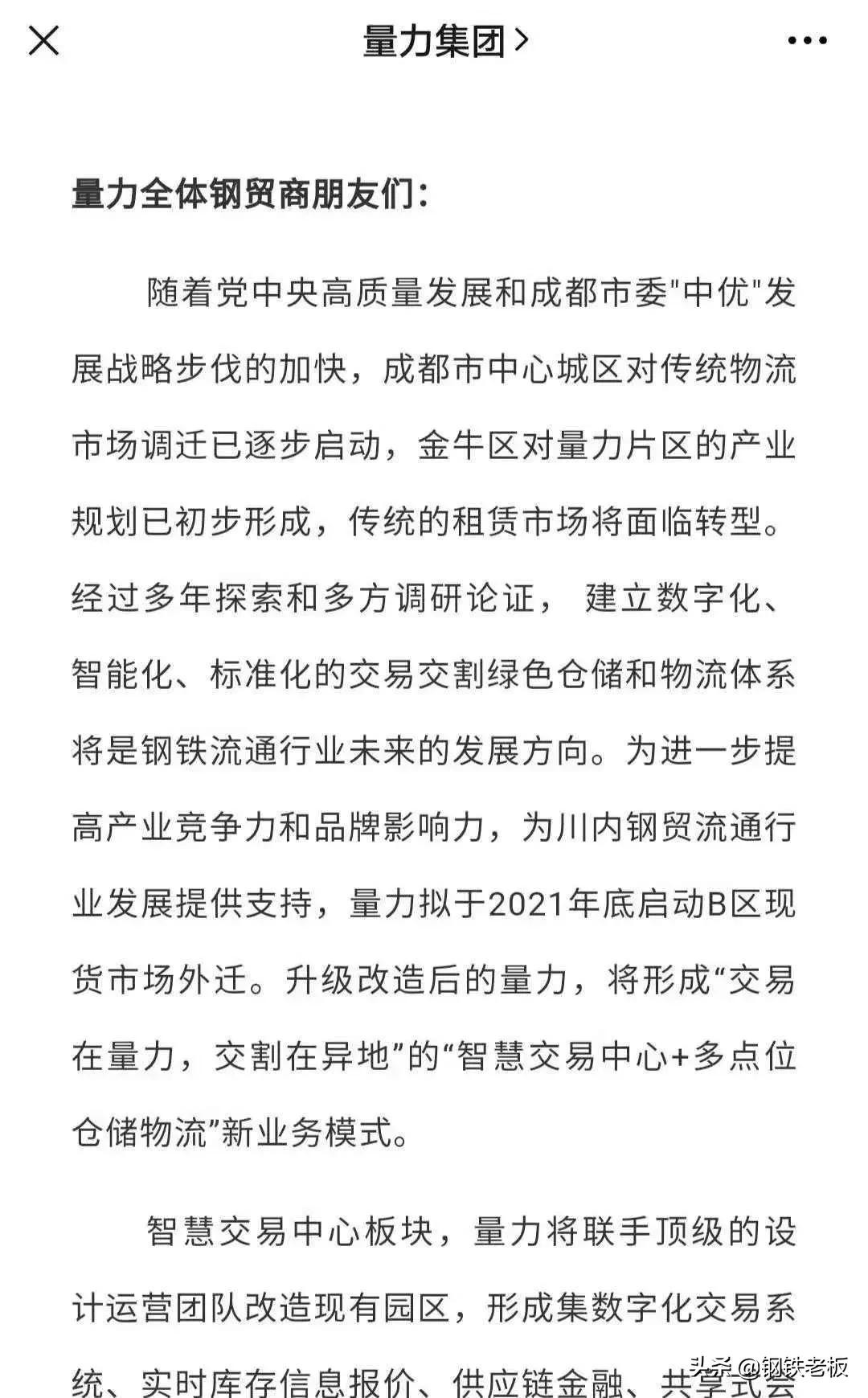 同时我们从量力集团官微中了解到,量力钢材城B区实行的是商家整体自行搬离计划,升级改造后的量力将形成“交易在量力,交割在异地”的“智慧交易中心+多点位仓储物流”新业务模式。