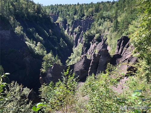 从西坡天池下来之后,坐旅游车继续下一个景点,长白山锦江大峡谷,100多米深的谷底,火山岩石经风化形成的奇形怪状的峭壁分散在谷底,我们只能远观,没有办法下到谷底,因为堆积的火山灰并不牢固,看上去就是松散的黑土一样。