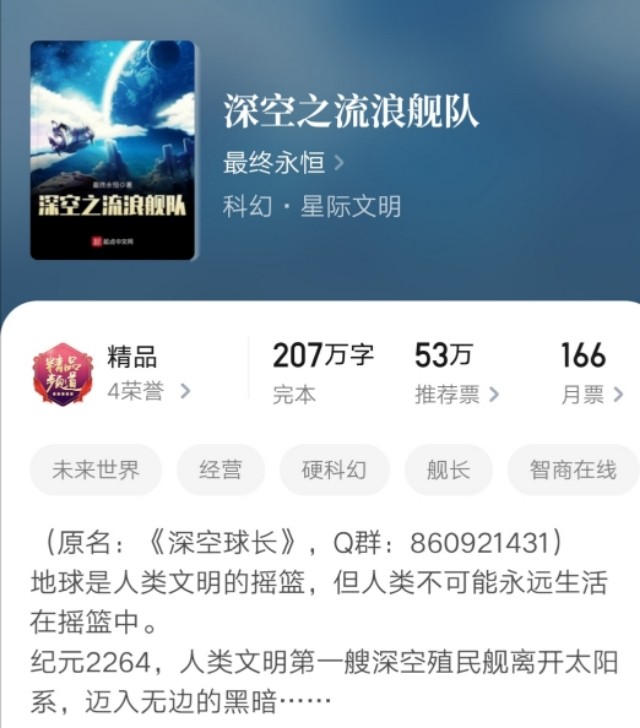 这里是上文介绍的那本获得银河奖的小说,此文逻辑严谨,数据考究,有科幻期刊故事的既视感。喜欢科幻类小说的不可错过,不了解这类的读者请看下它的优点。文笔精炼,形象生动,不会大量堆砌术语;剧情精彩,小小剧透一下,地球爆炸-诺亚计划-人类迁移-发现外星人-吓走外星人,太阳爆炸,继续流浪,其中的两次爆炸非常激动人心,高潮迭起,不过为什么人类走哪儿,哪儿爆炸?作者你怎么想的……另外此文角色智商在线,无套路,是一本非常有趣的科幻小说。