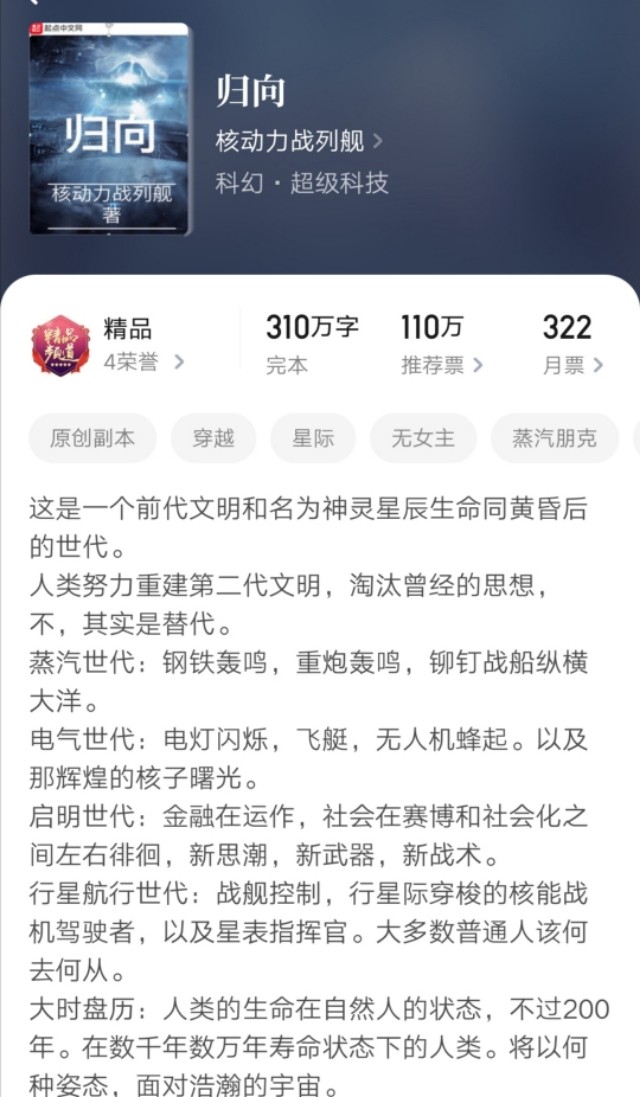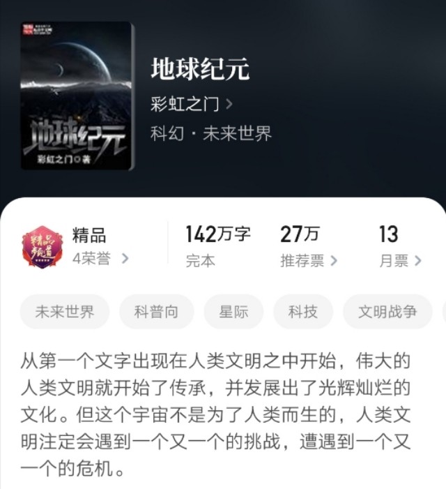 这是一本深受赞誉的硬核科幻,该作者的《深空之下》获得了29届银河奖,同样是一本严谨的科幻小说,所以此书质量有保证,放心入坑。这本小说描绘了不远的未来,人类社会合全球之力造了两艘移民飞船,长达三千年的航程,见证了地球的兴衰沉沦,也开启了新人类文明时代,整本书的时间跨越万年,书写了新人类文明的奋斗与崛起。