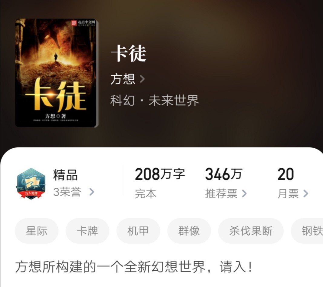 大神方想的作品,卡片流的开创者,小说描绘了一个完全由卡片为核心的力量体系,在这个世界,万事万物都需要卡片来维持,不同的卡片组合就会有不同的效果,千变万化。《卡徒》是十年前的作品了,独特的卡牌设计,精彩的战斗描写,冷静专注的主角性格,当年曾经是一本相当惊艳的小说。当然缺点也有,结尾过于仓促,这是作者的坏习惯。方想是起点曾经的大神级作家,现在的级别是离开后,再回来重新算的。
