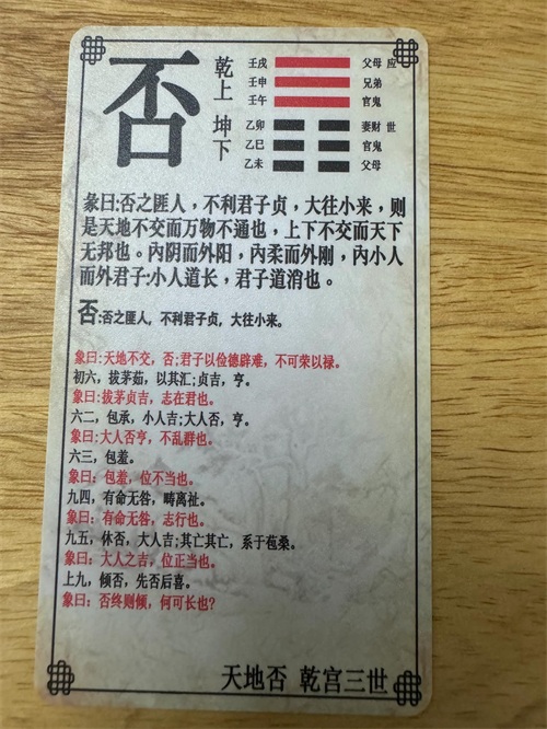 否卦是非常有意思的一卦,看卦辞和卦象,是非常不好的。但是如果看接下来的爻的象,六爻上下相应,六二和九五都是得中当位有应,乃是非常吉的象,可以说从爻整体的排面上,比泰卦的爻还好,但是恰恰卦象又截然相反。这说明,没有絕对的吉兇祸福,正如老子在《道德经》中所说“福兮祸之所倚,祸兮福之所伏”,万事万物都是福祸相伴,阴阳共生的。