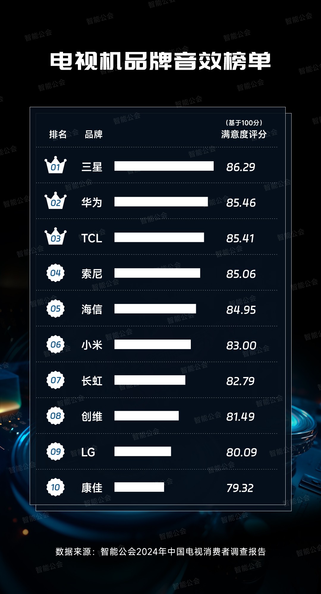 那么,哪个电视品牌最受消费者欢迎呢?近日,国内调研机构智能公会针对这一问题,做了个2024年中国电视消费者调查报告,并且针对用户满意度对2024年电视机品牌排行榜前十名进行了最新统计,其中三星电视、TCL电视、海信电视、索尼电视、小米电视、长虹电视、创维电视、LG电视、华为电视和康佳电视名列前十,是目前口碑最好的电视机品牌。