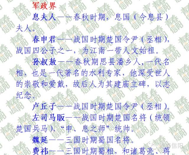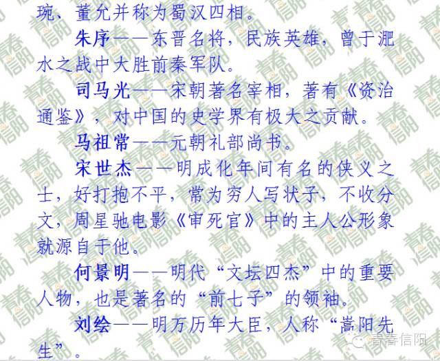 信阳其实也没有太多名人,也就是出了战国四公子之一的楚相春申君(见《芈月传》),宋朝宰相司马光,明代文豪何景明……,小编列了个详细清单,请看下图↓↓↓