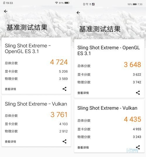 先看一下 CPU 部分,从跑分结果来看,两者跑分都在 27 万 +,基本持平,可以说这一次麒麟终于在性能这一块追上了骁龙旗舰 SoC。