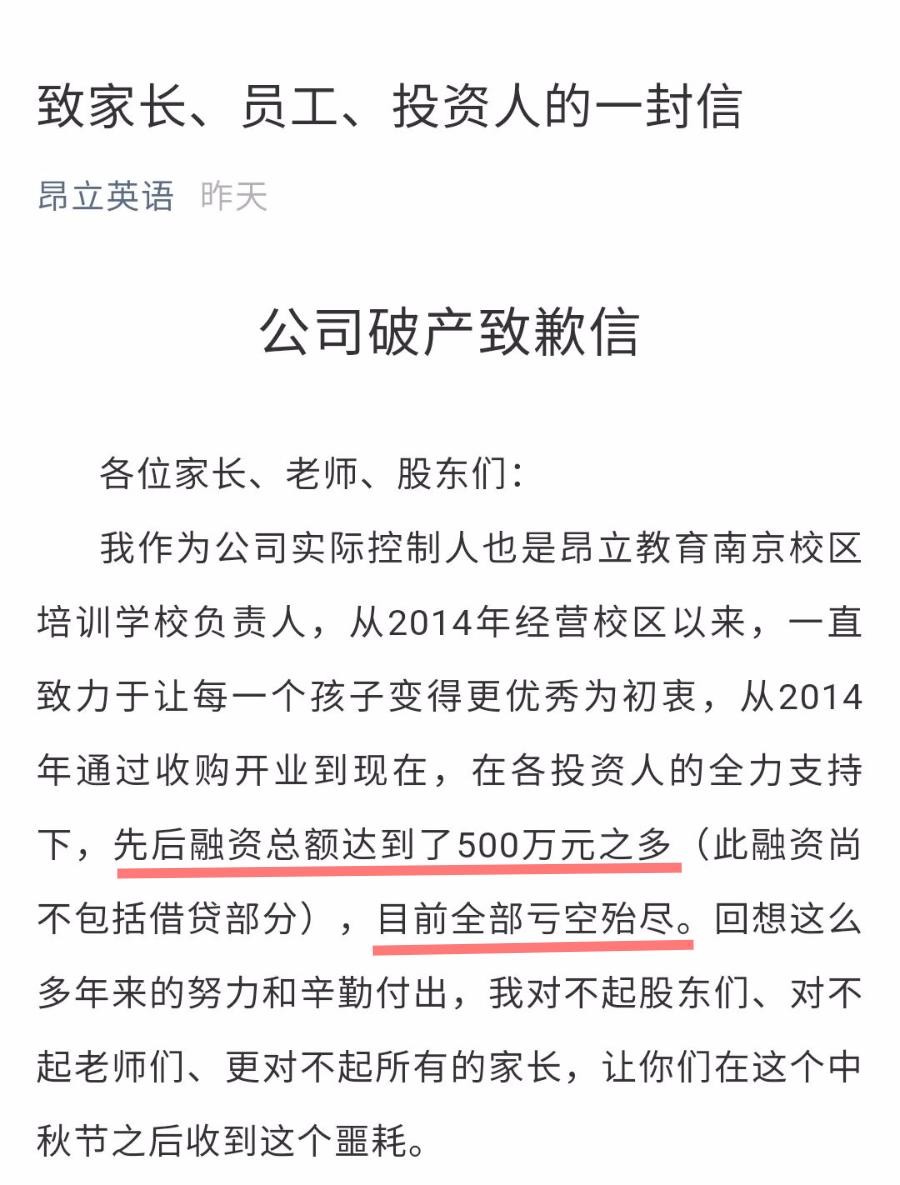 9月23日,一份《致家长、员工、投资人的一封信——公司破产致歉信》在名为“昂立英语”的微信公众号(微信号:Only84361866)上发出。