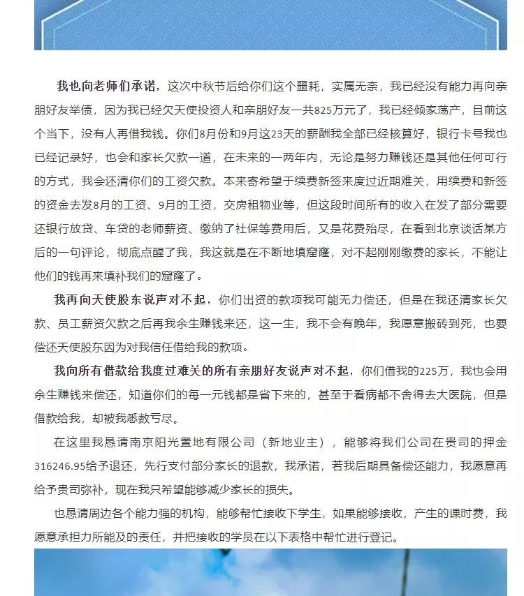 周国强表示,针对所有家长的欠款,目前现状退款已经退不出来了,已经进行了登记,会用余生工作赚钱来还。而对于拖欠的老师的工资,同样会在未来的一两年内,努力赚钱还清。