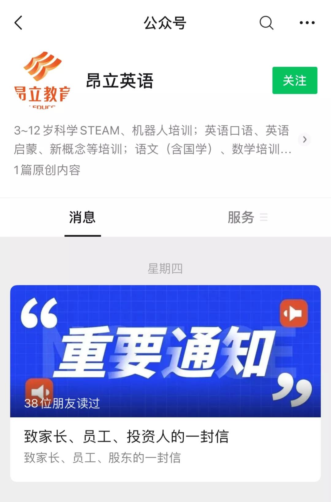 昂立教育同时在公告中表示,公司目前经营情况正常,相关课程均按照国家和地方要求有序进行,对于冒用其公司名义,故意注册与其公司相近似的“昂立英语”公众号,混淆视听的行为,公司表示强烈谴责,并将依法追究相关人员的法律责任。