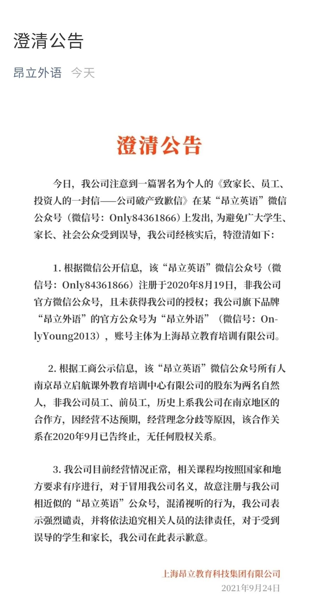 9月24日,上海昂立教育科技集团有限公司在其官方微信公众号发布了一份澄清公告。