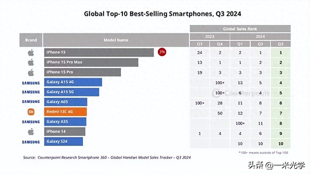 近期,调研机构 Counterpoint Research 最新发布了2024年第3季度全球最畅销智能手机排行榜,这一报告无疑吸引了全球科技界与消费者的广泛关注。其中所显示的数据令人瞩目,iPhone 15 系列以无可阻挡的强大态势直接霸占了排行榜的前三位,充分展现了其在全球智能手机市场中的霸主地位。