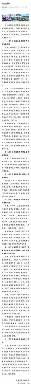 2月13日,山东青岛即墨区联合调查组发布情况通报,称反映江秋莲求助捐款涉嫌诈骗与事实不符。同时,调查组还对江秋莲名下关联企业及涉税问题、使用POS机代刷套现问题、获得王家官庄村回迁房问题、侵占“五保户”宅基地及隐瞒另育有一子等问题进行了调查,均未发现问题。此外,调查组还对王某杰为职业放贷人问题进行了调查,发现网传图片系原告上诉的陈述内容,不是法院查明确认的事实。