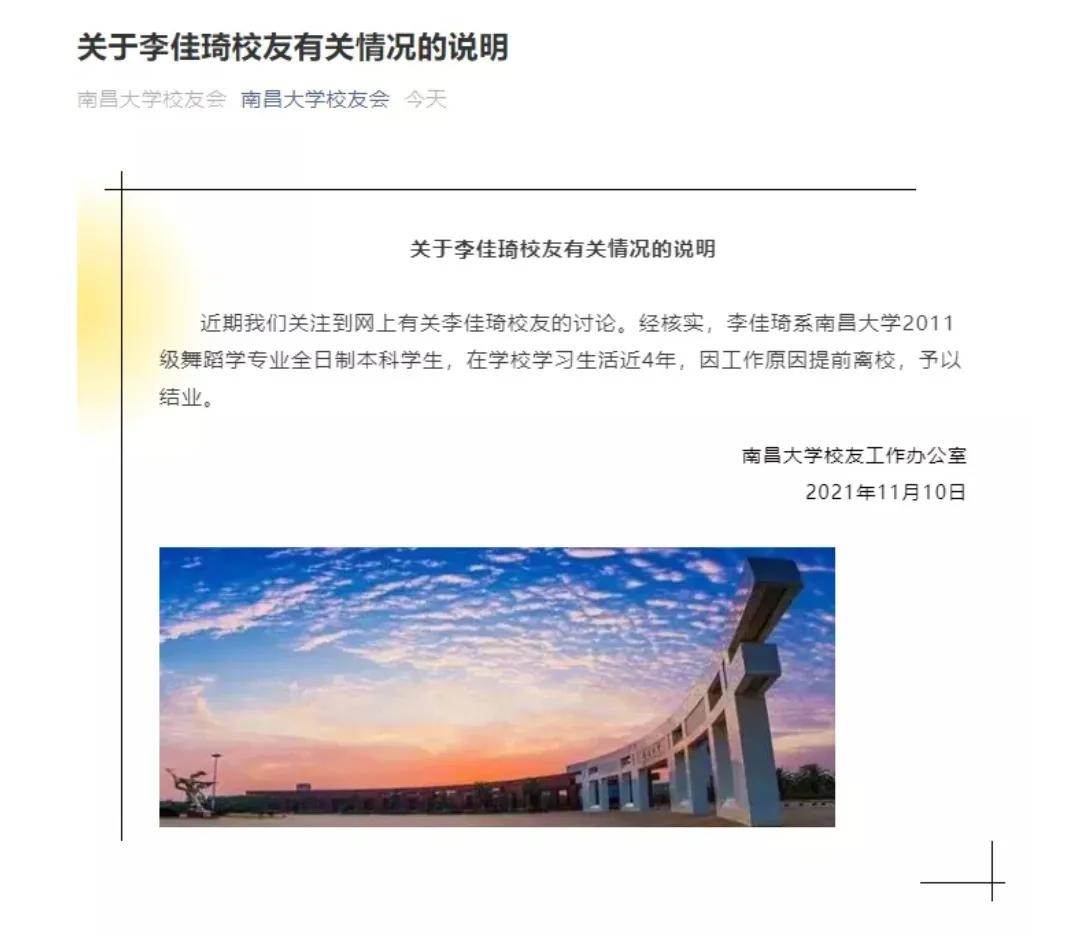 是此前的大学校友身份造假,还是另有隐情?对此,11月10日下午,南昌大学校友工作办公室发布“关于李佳琦校友有关情况的说明”,其中提到,近期我们关注到网上有关李佳琦校友的讨论。经核实,李佳琦系南昌大学2011级舞蹈学专业全日制本科学生,在学校学习生活近4年,因工作原因提前离校,予以结业。