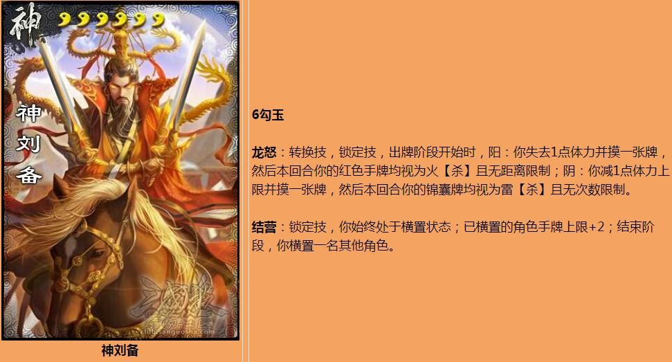玩家对神刘备一直诟病连连,无非是因为神刘备的技能负面效果太强,我们先来看看他的两个技能——龙怒和结营。这两个技能都是锁定技,龙怒是在牺牲血量的状态下,换来强大的输出和爆发,过牌量有所加强,可以视作神关羽武魂的升级技。