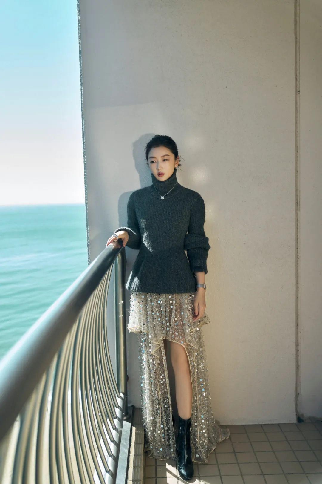 在一次活动中,她就以精致妆容搭配灰色毛衣和薄纱亮片半裙,展现出柔和知性的气息。