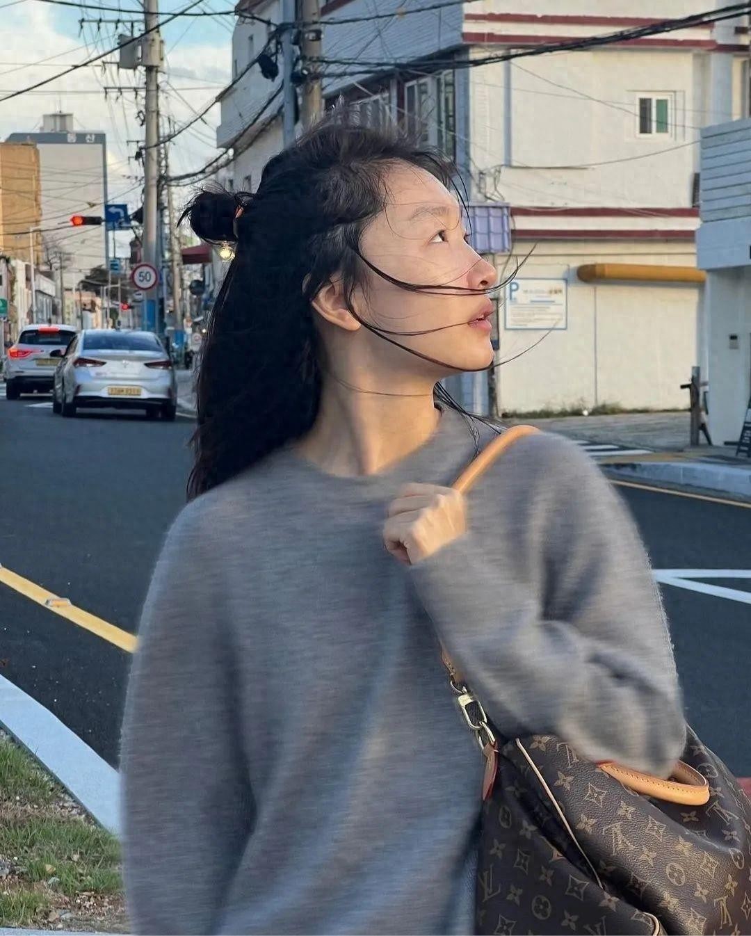 但最让人印象深刻的,反而是那身简约的灰毛衣黑裤组合。