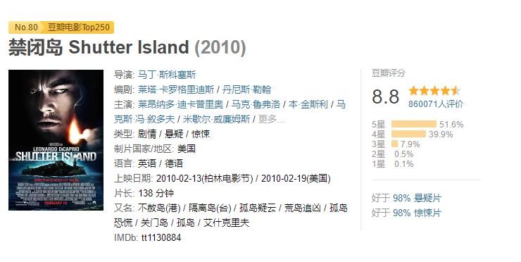 小李子神作,我只想说:这部片子看得我犯迷糊,看了两遍,第一遍看到最后男主就是个疯子,看了第二遍又感觉他没疯……男主到底疯没疯,我是不知道了,我感觉我要疯了。