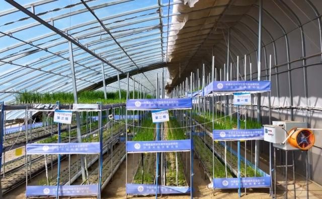 温室采用双层结构设计,冬季可以有效保温。为解决沙漠地区昼夜温差大的问题,棚内配备了主动蓄放热和空气取热装置。白天,太阳照射使大棚内的温度升高时,系统会通过水流将多余的热量储存在温室下方的蓄水池中,晚上气温降低时再释放热量,确保大棚内的温度稳定。这样的设计不仅实现了保温效果,还大幅度减少了能源消耗,达到了节碳目的。在这茬收获前,这里已收了三茬水稻。