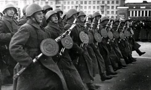 苏联阅兵时手持DP机枪的苏联士兵