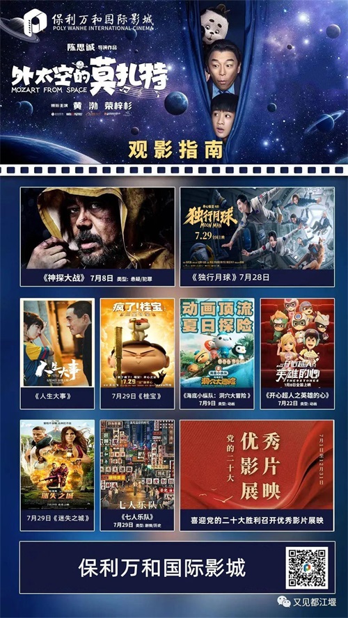 保利万和国际影城为广大观众奉上观影指南!《外太空的莫扎特》、《神探大战》、《独行月球》、《桂宝》等大片一应俱全,还有喜迎党的二十大胜利召开优秀影片展映正在火热进行中!