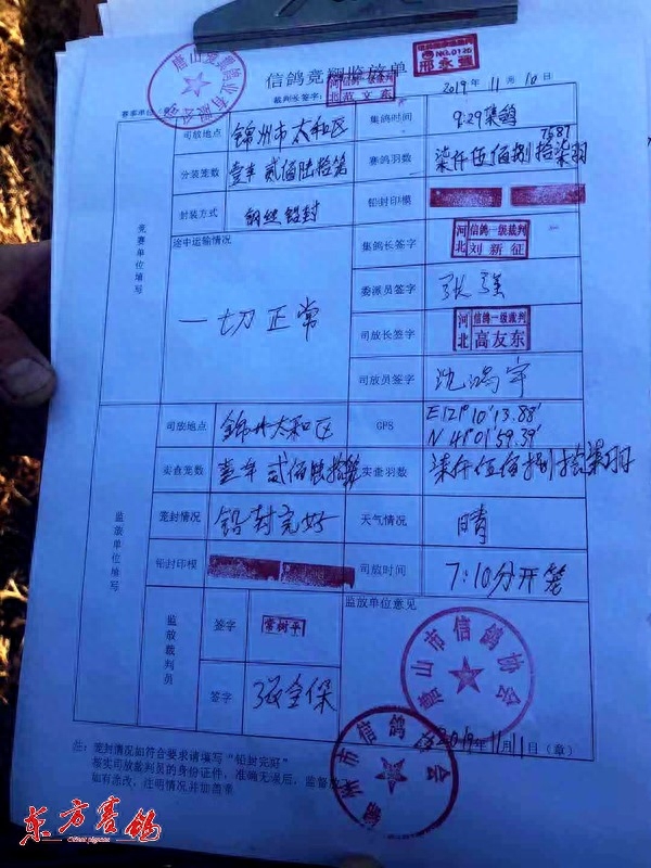 开尔国际爱心公棚的司放地监放裁判员是唐山市信鸽协会和辽宁锦州市信鸽协会选派的裁判员全程监放的,他们无暇冷暖,全神贯注地核对监放数据,填写监放单,准备开笼。看他们工作的认真劲儿,不由感慨,人们去做一件事情的时候,总是希望把事情做成功做完美。我觉得鸽界的裁判们尤其是如此。