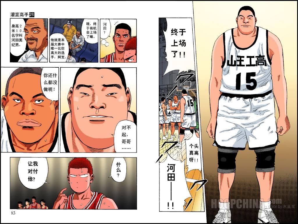 和田雅史,《灌篮高手》中的顶级中锋。日本高校最强中锋之一,超强的防守技术和篮板能力,连赤木刚宪和樱木花道都难与他抗衡,曾在与湘北的比赛中一度将神奈川的第一中锋“大猩猩”赤木逼到绝境,连续盖掉湘北火锅。他原来是后卫,因为身高在一年内长了25cm,所以位置变成小前锋,后来又变成中锋。因为他兼有前锋线和后防线的经验和技术,又拥有外线级别的运动能力和内线顶尖的对抗能力,所以可说是个超级中锋。日本大学篮球界的顶尖球队深沢体育大学的教练唐泽一雄和主力中锋杉山洋太这么评价河田雅史:“即使以他现在的状况直接进入大学篮球界,也绝对是全国排名前三强的中锋!”