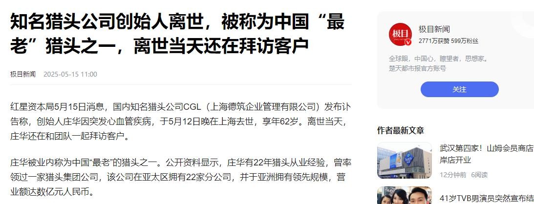 亿万"猎头大佬"突发疾病离世,享年62岁,当天上午还在拜访客户