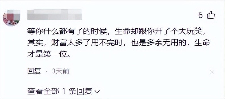 很多网友们也纷纷感慨:“十亿买不到十分钟"。是啊,当我们拼命赚钱的时候,千万别忘了留点时间给自己和家人。