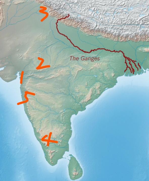 1)位置都不在恒河干流一带(恒河在印度北方偏东部)。