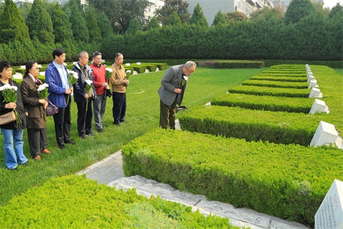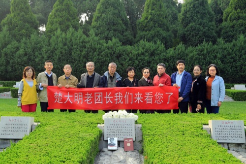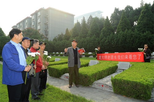 寒露时节的华北军区烈士陵园绿荫幽草,枫树等彩叶树开始有了斑驳的色彩。 10月10日,陵园迎来了一拨远道而来的客人——八路军第129师第386旅革命先辈的后人们,他们从重庆、杭州、青岛等地赶来,给安眠在陵园东墓区的革命先烈楚大明扫墓。