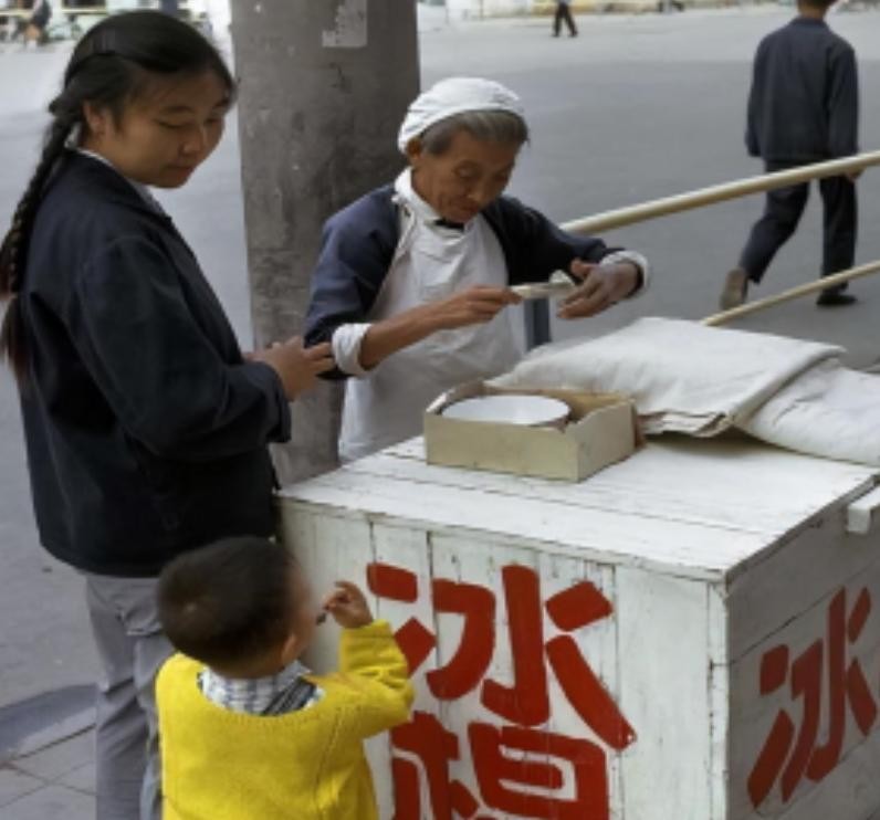 一名年轻的女子正在一处街边卖冰棍的摊位前给自己的孩子买冰棍吃
