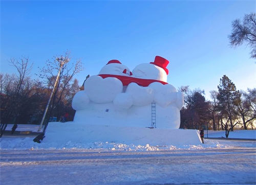 记者了解到,“亲亲雪人”的雕刻工作已然大功告成,工匠们正全神贯注地投身于精细修缮环节。这对“贴贴”且手捧爱心的雪人,宛如冬日里的精灵,散发着独特的魅力。设计师用细腻如丝的线条勾勒出雪人的轮廓,赋予它们鲜活的生命力。与此同时,“雪韵国粹 - 青花瓷”雪雕的创作正稳步推进,这一雪雕作品以中国传统艺术瑰宝青花瓷为核心展开创作,其瓶身的雕琢已完成过半,初现的轮廓已令人惊叹,后续将完成雪雕上色工作。