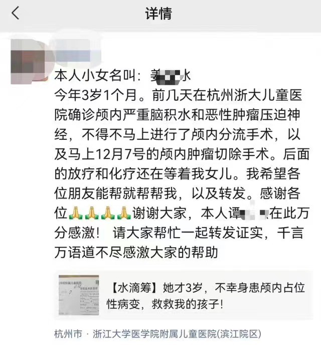 12月2日,冰冰做了分流手术,将脑积水引流出来,12月7日还需要做颅内肿瘤切除手术。“医生说,要把肿瘤切除了,手术费加起来一共十几万。后期还要放疗化疗,也还有比较大一笔费用。”因经济上有困难,谭女士在朋友圈发出了为冰冰治病筹款的链接。