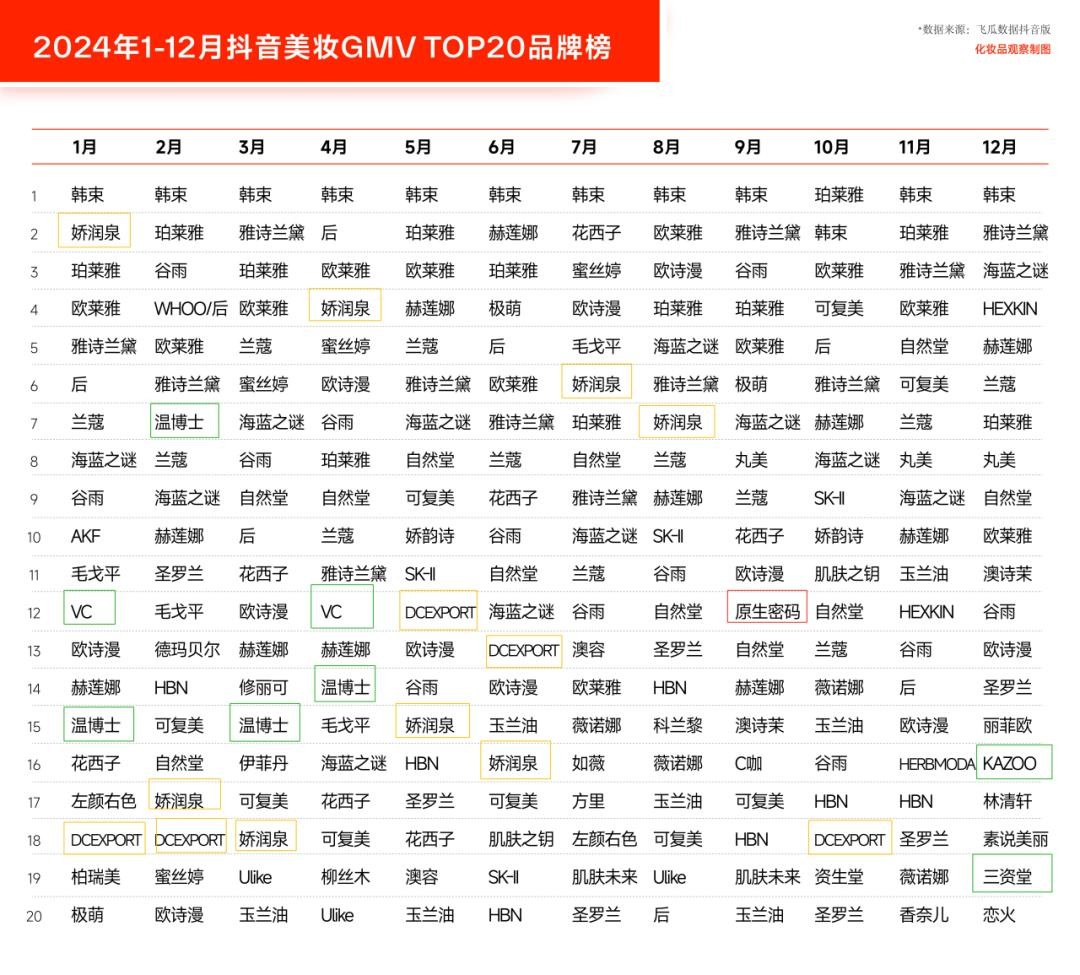 抖音美妆月度GMV TOP20榜再次出现“厦门帮”的身影已是2024年12月,新生代如KAZ00、三资堂异军突起,前者跻身TOP16,但此后再无缘榜单;后者跻身TOP19,2025年1月再度跻身TOP7。