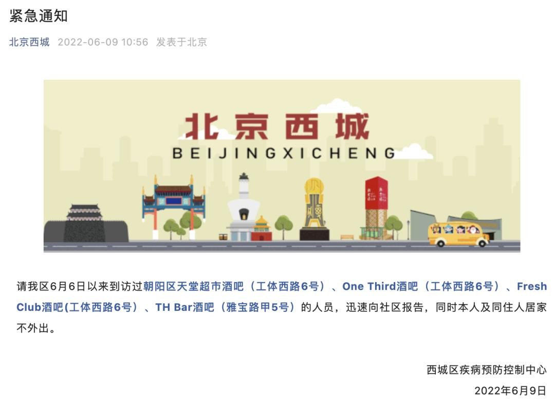 请我区6月6日以来到访过朝阳区天堂超市酒吧(工体西路6号)、One Third酒吧(工体西路6号)、Fresh Club酒吧(工体西路6号)、TH Bar酒吧(雅宝路甲5号)的人员,迅速向社区报告,同时本人及同住人居家不外出。