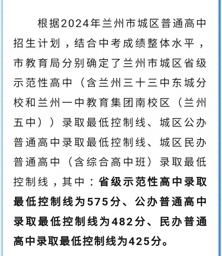 官方消息显示,2024年兰州务省级示范性高中的最低录取控制线为575分,公办普通高中的最低录取控制线为482分,民办普通高中的最低录取控制线为425分。