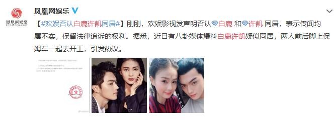 随后,欢娱影视发布声明否认两人同居传闻,表示:“有关许凯、白鹿恋爱和疑已同居的传闻均属不实”。并对少数媒体和营销号将主观臆测当做新闻,强加于演员和经纪公司的不实行为予以谴责,公司方将保留法律追诉的权利。
