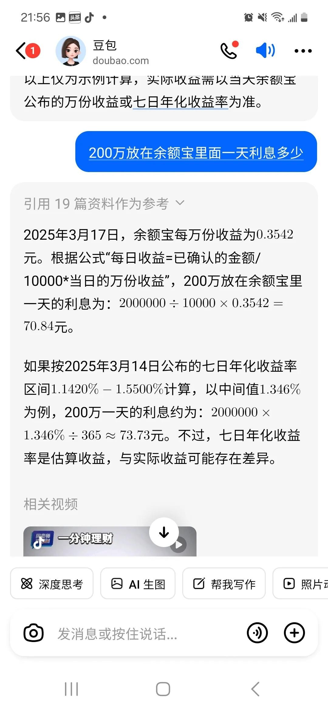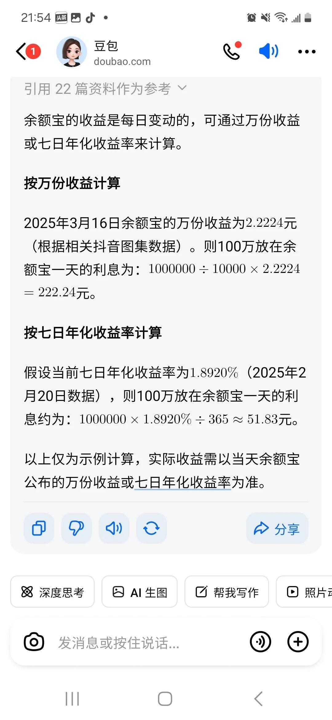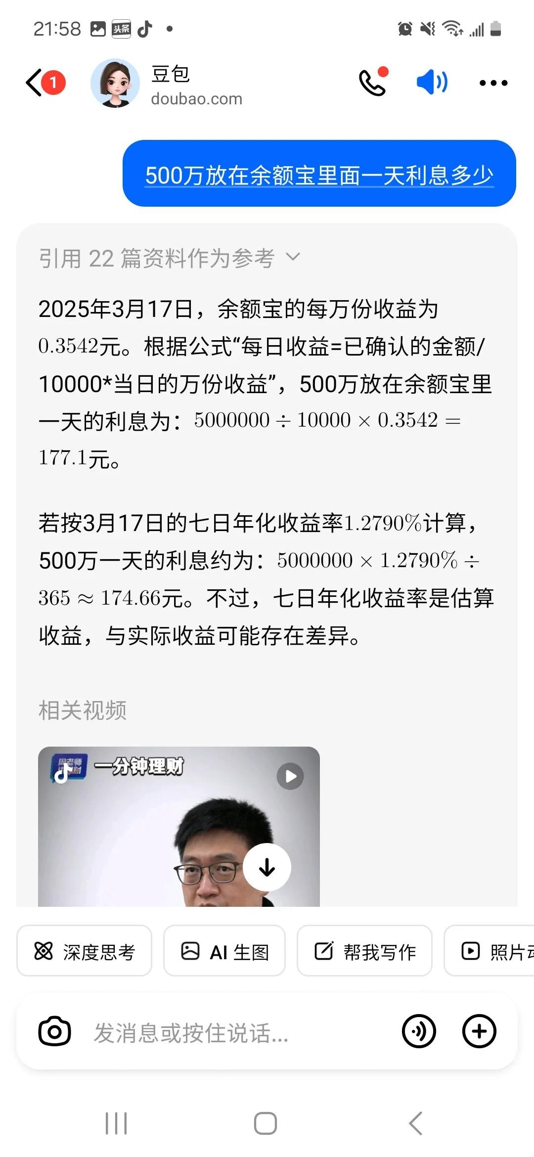 我昨天晚上问豆包50万,100万,500万放在余额宝里面一天的利息是多少?吓我一跳,50万存在余额宝里面一天的利息才一顿饭钱,100万放在余额宝里面一天的利息才够一天的饭钱,500万呢,一顿饭钱加下午茶,哈哈,像我们普通人存个50万都不错了,还500万,太难了,看来要靠利息生活,不动本金,至少要1000万才能靠利息生活,而且要在没房贷,车贷,各种贷,没有负债的情况下。所以网络上一直说啥时候能完全靠利息生活,除非你回老家,老家有自建房,没有任何负债,那50万吃是没啥问题了,如果想出去旅游旅游,那就很难了,所以靠利息生活,对于大部分人来说想想就可以了,努力存钱,来源节流才是关键