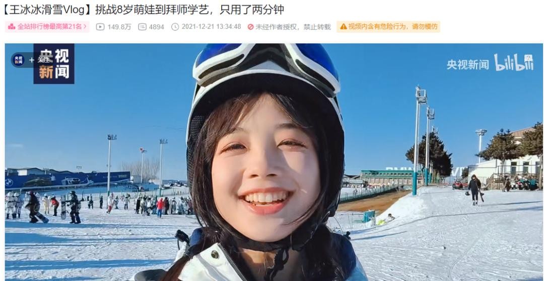 2020年的最后一天,王冰冰在哔哩哔哩网站上开设了个人账号,并发布了一则vlog,分享了冬天必去的几个地方。这个视频一经发布就占据了平台播放榜首,播放量高达两千多万次。