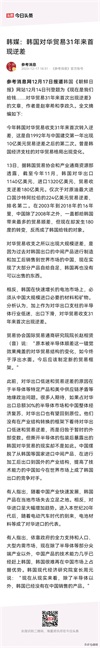 总之,韩国对华贸易逆差是31年来的首次转变,这预示着全球贸易格局正在经历深刻调整。韩国需要重新审视其贸易策略,寻找新的市场和合作伙伴,以应对全球贸易格局的变化。同时,也需要更加谨慎地处理与中国的经贸关系,确保自身的利益不受损害。#头条小组红人扶持计划##头条创作挑战赛##冬日生活打卡季##今日头条热榜##妙笔生花创作挑战#