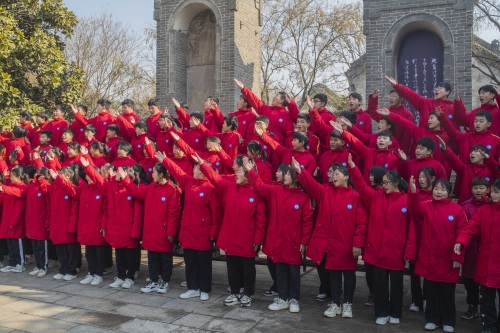 “怒发冲冠,凭栏处、潇潇雨歇。抬望眼,仰天长啸,壮怀激烈。三十功名尘与土,八千里路云和月。莫等闲、白了少年头……”1月31日早上,开封市祥符区朱仙镇岳飞庙的庭院里不断传出慷慨激昂的诵读声,朱仙镇一中近百名身着红色校服的中学生在齐声朗诵岳飞的《满江红·写怀》。