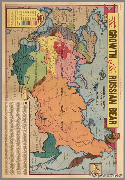 该地图追溯了俄罗斯的历史,从 15 世纪作为附庸鞑靼国家的卑微开始,到今年成为一个伟大帝国的顶峰就在希特勒军队入侵之前。虽然这个国家的故事充满了血腥的征服和吞并,但领土损失很少且相对较小。