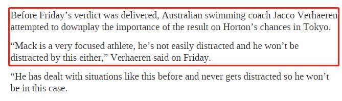 在周五的判决公布之前,澳大利亚游泳教练对外公开夸赞霍顿的专业能力,称:他是一名非常专注的运动员,他不易分心,也不会因此而分心,毕竟他以前也处理过这样的情况,也不会参与进去。说这话的样子,仿佛已经提前预知了结果.....